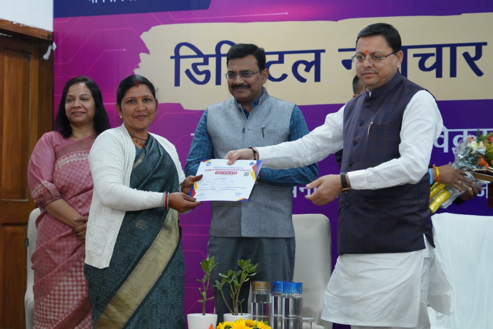 मुख्यमंत्री श्री पुष्कर सिंह धामी ने रविवार को मुख्य सेवक सदन, मुख्यमंत्री आवास, देहरादून में आयोजित कार्यक्रम में प्रतिभाग करते हुए ’डिजिटल नवाचार से सुशासन की ओर’ के अन्तर्गत सूचना प्रौद्योगिकी विकास एजेंसी द्वारा निर्मित विभिन्न एप एवं पोर्टल का शुभारम्भ किया। इस दौरान उन्होंने विभिन्न ग्राम प्रधानों को डिजिटल साक्षर बनाने की दिशा में कराये गये प्रशिक्षण के सर्टिफिकेट वितरित किए।