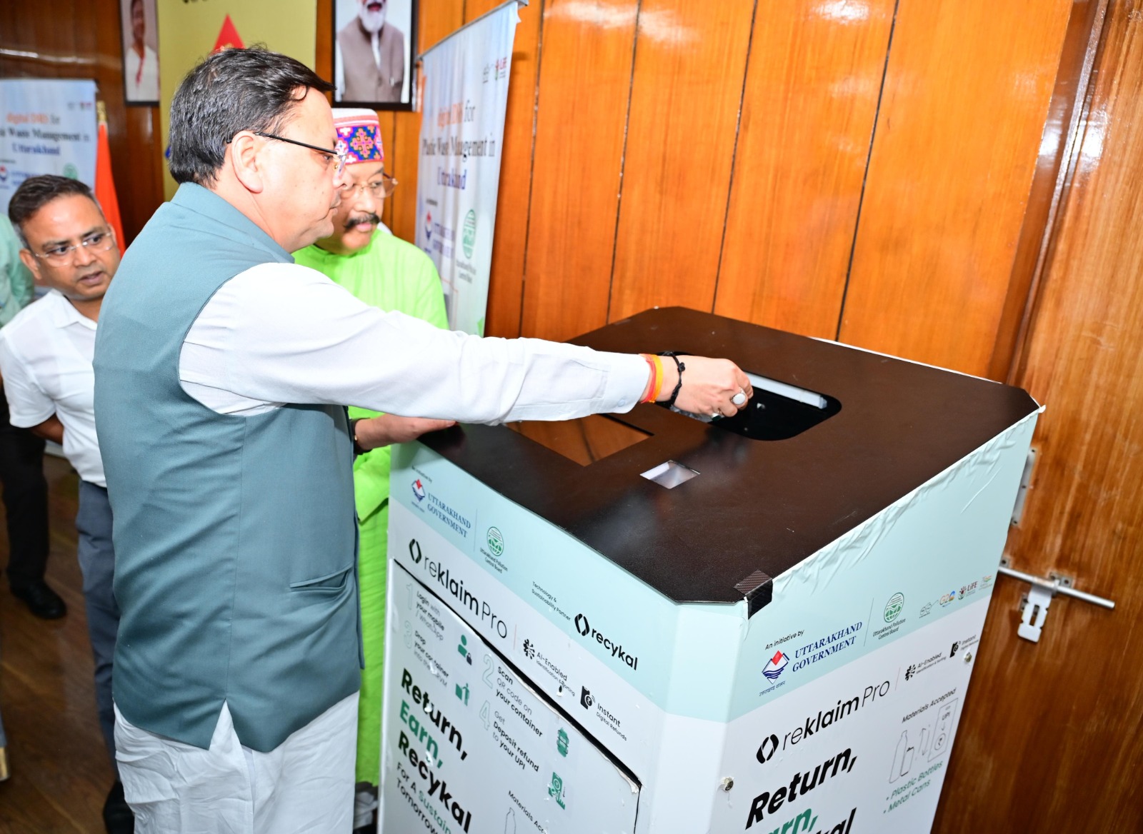 मुख्यमंत्री श्री पुष्कर सिंह धामी ने बुधवार को सचिवालय में प्रदूषण नियंत्रण बोर्ड द्वारा संचालित प्लास्टिक वेस्ट मैनेजमेंट के डिजिटल डिपॉजिट रिफंड सिस्टम का शुभारंभ किया। इस अवसर पर मुख्यमंत्री ने स्वयं प्लास्टिक की बोतल को बार कोड से स्कैन कर डिजिटल पेमेंट प्राप्त किया।