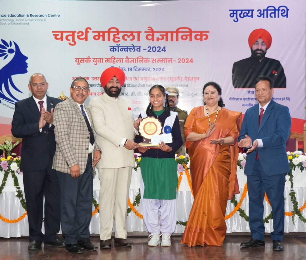 राज्यपाल लेफ्टिनेंट जनरल गुरमीत सिंह (से नि) ने गुरुवार को उत्तराखण्ड विज्ञान शिक्षा एवं अनुसंधान केन्द्र (यूसर्क) द्वारा आईआरडीटी सभागार, देहरादून में आयोजित महिला वैज्ञानिक कॉन्क्लेव का शुभारंभ किया। इस अवसर पर राज्यपाल ने विज्ञान एवं विज्ञान शिक्षा के क्षेत्र में उत्कृष्ट कार्य करने वाली महिला वैज्ञानिकों को सम्मानित किया और उनके प्रयासों की सराहना की। इस दौरान ‘‘युवा महिला वैज्ञानिक उत्कृष्टता सम्मान-2024’’ से डॉ. प्रतिक्षा जोशी, कु. तनुजा आर्या, कु. बहार अंजुम, डॉ. दीप्ति रावत को और ‘‘युवा महिला वैज्ञानिक उपलब्धि सम्मान-2024’’ से डॉ. मीनाक्षी राणा, डॉ. अर्चना ध्यानी, कु. बिनु सिंह, डॉ. निर्जरा सिंघवी, डॉ. मनु पंत, डॉ. श्रद्धा बिष्ट, डॉ. नीतू पाण्डेय, डॉ. दिव्या सिंह एवं डॉ. पवनिका चन्दोला को सम्मानित किया गया। इसके अलावा 03 छात्राओं निहारिका नेगी, दृष्टि चौहान और श्रेया रौतेला को ‘‘विज्ञान चेतना छात्रा सम्मान’’ से सम्मानित किया।