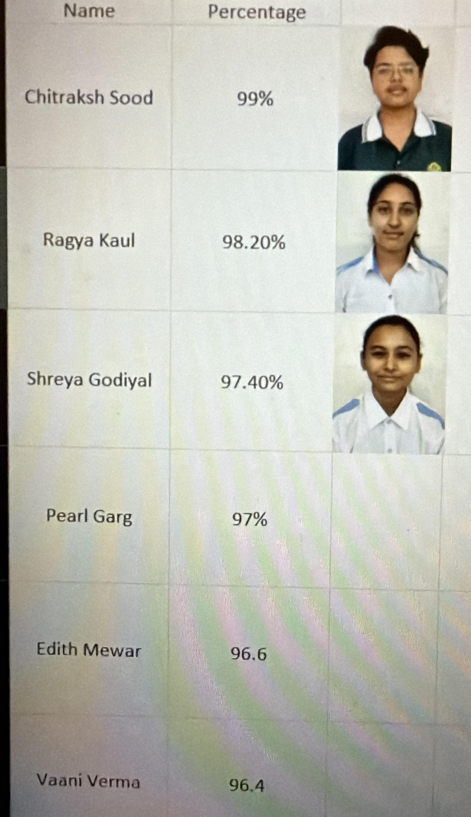 विद्यालय के होनहार छात्र चित्राक्ष सूद ने 99% अंक प्राप्त कर प्रथम स्थान प्राप्त किया, जबकि राज्ञा कॉल ने 98.2% अंक हासिल कर द्वितीय स्थान प्राप्त किया।