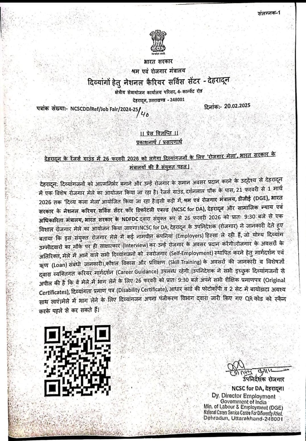 दिव्यांगजनों को आत्मनिर्भर बनाने और उन्हें रोजगार के समान अवसर प्रदान करने के उद्देश्य से देहरादून में एक विशेष रोजगार मेले का आयोजन किया जा रहा है। रेंजर्स ग्राउंड, दर्शनलाल चौक के पास, 21 फरवरी से 1 मार्च 2026 तक ‘दिव्य कला मेला’ आयोजित किया जा रहा है। इसी कड़ी में, श्रम एवं रोजगार मंत्रालय, डीजीई, भारत सरकार के नेशनल करियर सर्विस सेंटर फॉर डिफरेंटली एबल्ड, देहरादून और सामाजिक न्याय एवं अधिकारिता मंत्रालय, भारत सरकार के एनडीएफडीसी द्वारा संयुक्त रूप से 26 फरवरी 2026 को प्रातः 9ः30 बजे से एक विशाल रोजगार मेले का आयोजन किया जाएगा। एनसीएससी फार डीए, देहरादून के उपनिदेशक (रोजगार) ने जानकारी देते हुए बताया कि इस संयुक्त रोजगार मेले में कई नामचीन कंपनियां हिस्सा ले रही हैं, जो योग्य दिव्यांग उम्मीदवारों का मौके पर ही साक्षात्कार कर उन्हें रोजगार के अवसर प्रदान करेंगी। रोजगार के अवसरों के अतिरिक्त, मेले में आने वाले सभी दिव्यांगजनों को स्वरोजगार स्थापित करने हेतु मार्गदर्शन एवं ऋण संबंधी जानकारी, कौशल विकास और प्रशिक्षण के अवसरों की जानकारी व विशेषज्ञों द्वारा व्यक्तिगत करियर मार्गदर्शन उपलब्धता रहेगी। उपनिदेशक ने सभी इच्छुक दिव्यांगजनों से अपील की है कि वे मेले में भाग लेने के लिए 26 फरवरी को प्रातः 9ः30 बजे अपने सभी शैक्षिक प्रमाणपत्र, दिव्यांगता प्रमाण पत्र, आधार कार्ड की फोटोकॉपी व 2 सेट में बायोडाटा अवश्य साथ लाएं। मेले में भाग लेने के लिए दिव्यांगजन अपना पंजीकरण विभाग द्वारा जारी किए गए क्यूआर कोड को स्कैन करके पहले से कर सकते हैं।