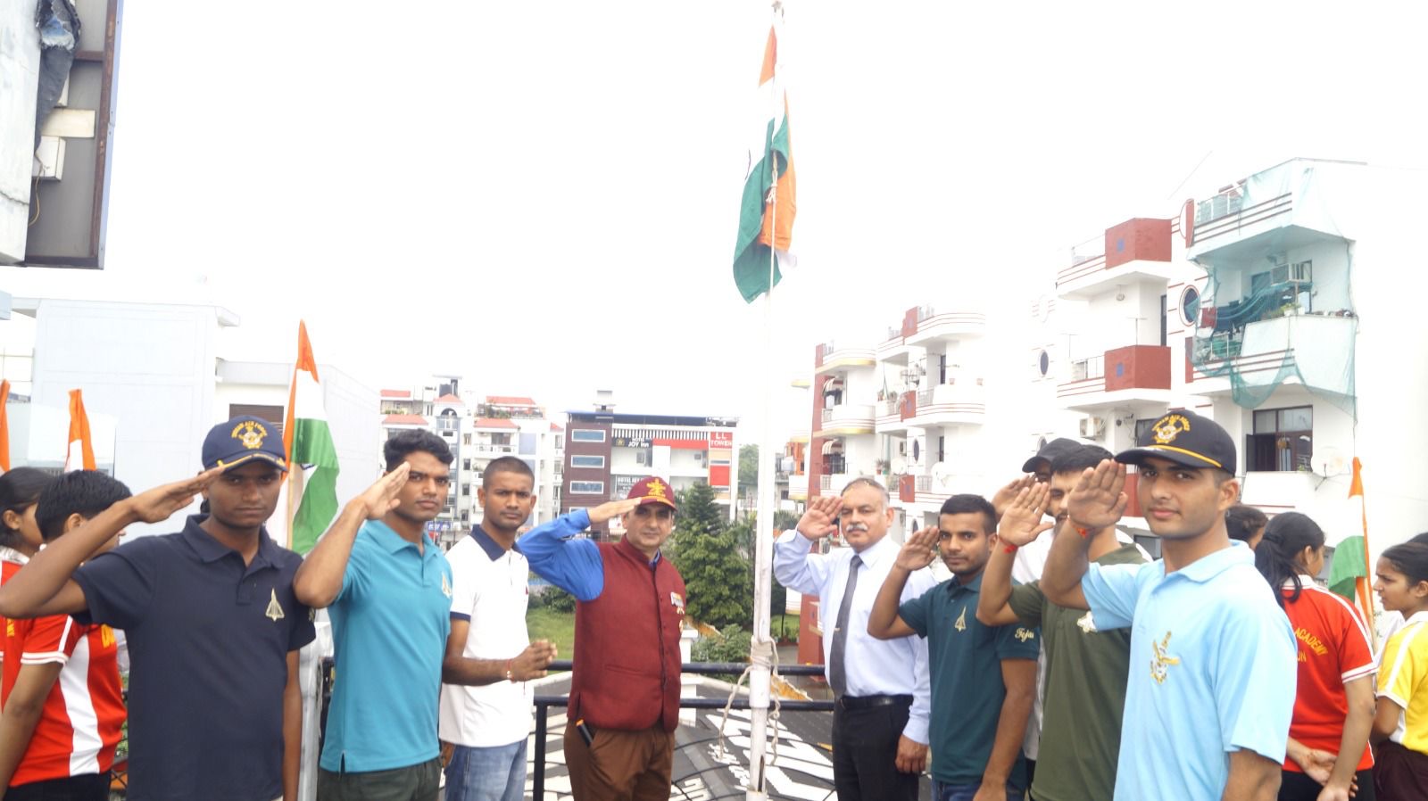 DDA001-स्वतंत्रता दिवस पर संदीप सर दून डिफेंस एकेडमी मुख्यालय में तिरंगा फहराने के बाद सेल्यूट करते अग्निवीर बने डीडीए डायमंड्स।