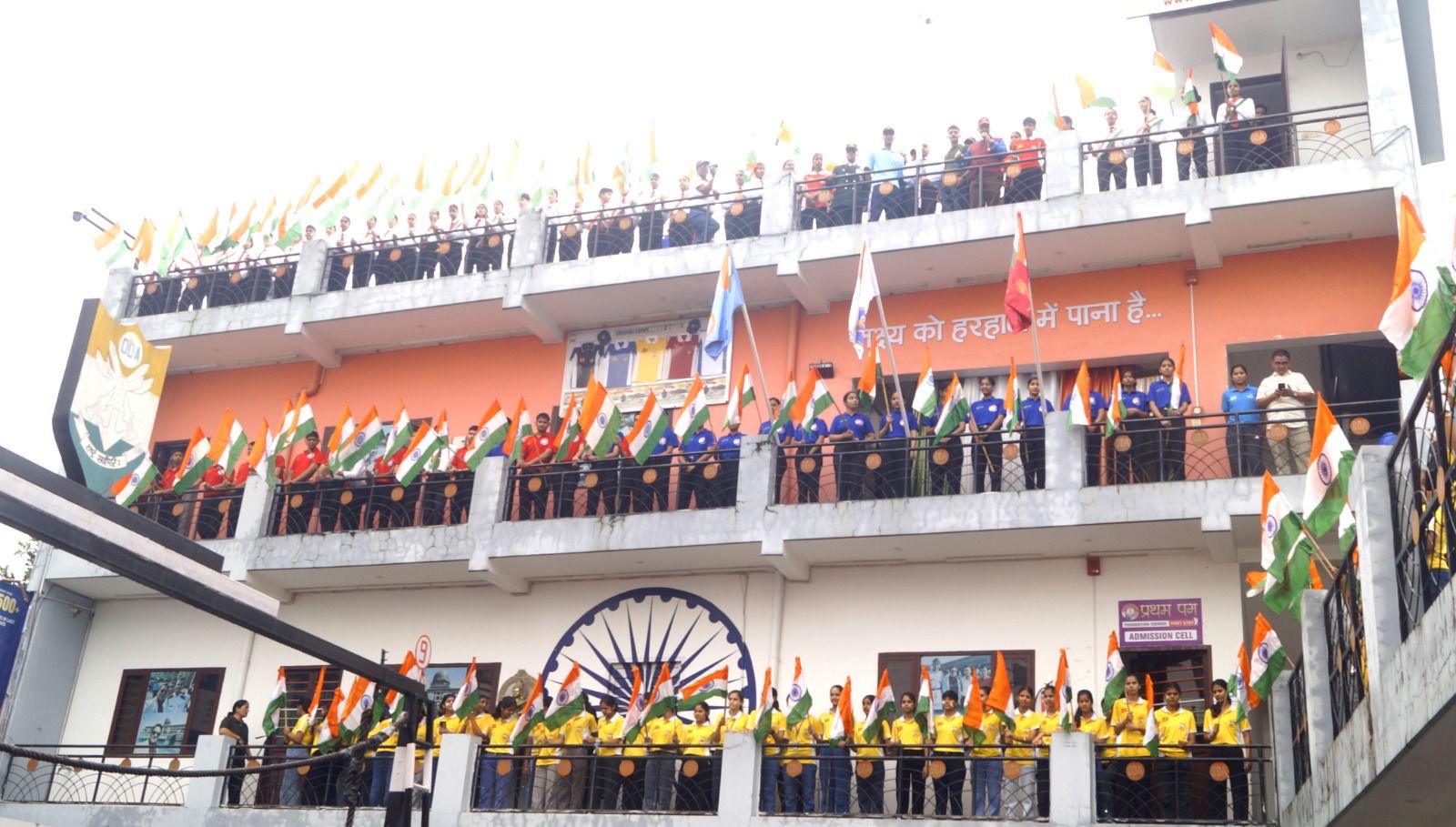 DDA004-स्वतंत्रता दिवस पर संदीप सर दून डिफेंस एकेडमी मुख्यालय में हाथों में तिरंगा लिए डीडीए डायमंड्स।