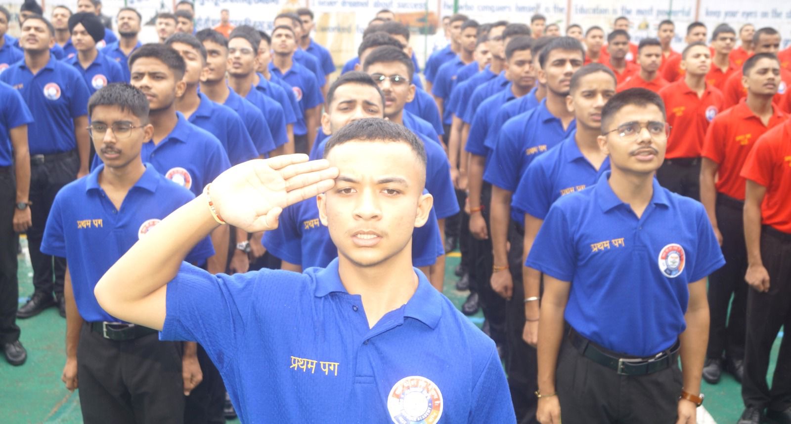 DDA005-स्वतंत्रता दिवस पर संदीप सर दून डिफेंस एकेडमी द्वारा संचालित फॉउंडेशन कोर्स प्रथम पग कैंपस त्रिशक्ति में तिरंगे को सेल्यूट करता कैडेट्स।