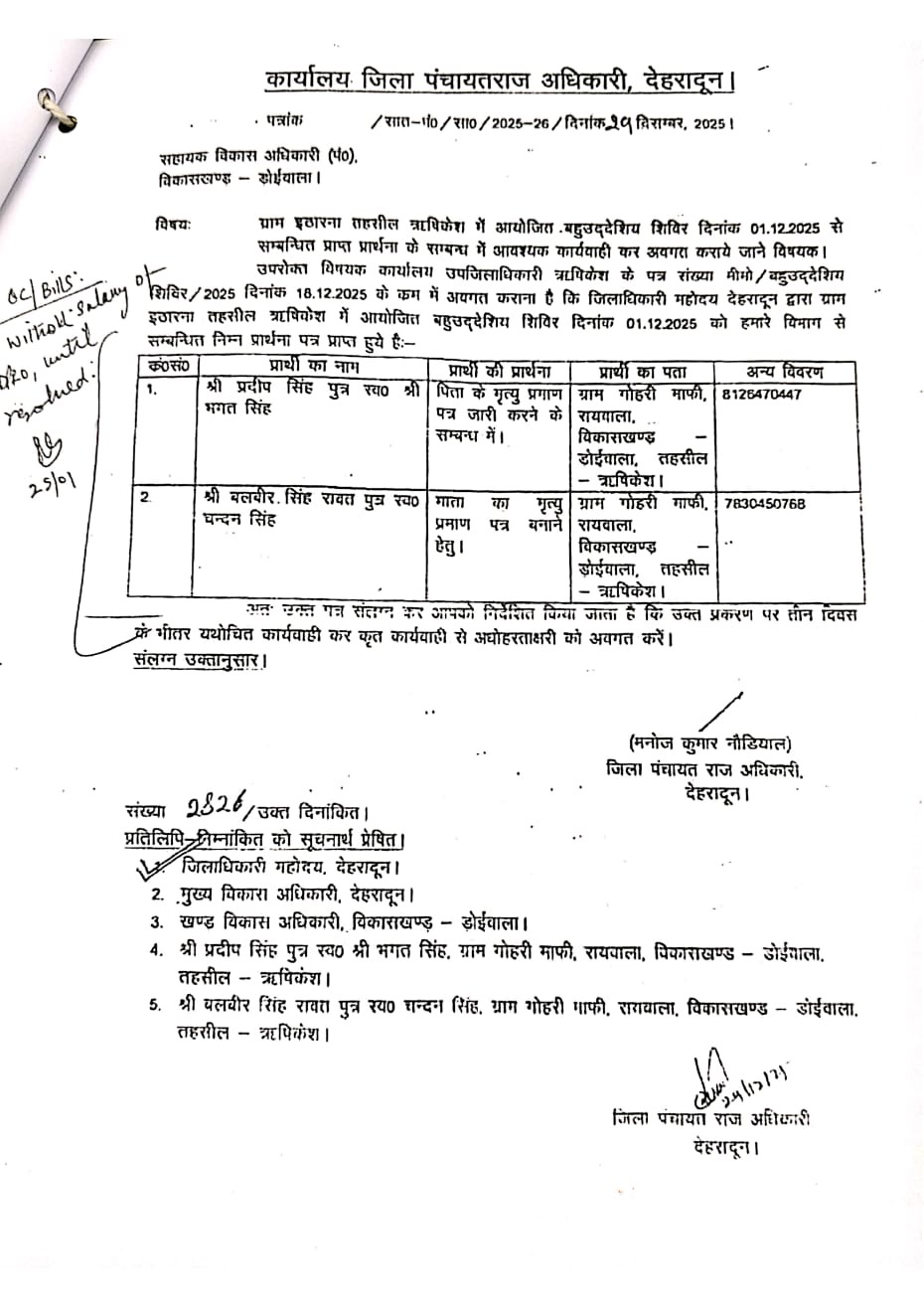 देहरादून, दिनांक 11 फरवरी 2026 (सूवि) जिलाधिकारी सविन बंसल की अध्यक्षता में जिले के विकास खंड डोईवाला ग्राम इठारना, तहसील ऋषिकेश में 01.12.2025 को आयोजित बहुउद्देशीय शिविर में प्राप्त शिकायतों के क्रम में जिला प्रशासन ने सख्त कार्रवाई की है। ग्राम पंचायत गौहरी माफी निवासी प्रदीप सिंह पुत्र स्व० भगत सिंह द्वारा अपने पिताजी का मृत्यु प्रमाण पत्र जारी किए जाने तथा बलबीर सिंह रावत पुत्र स्व० चन्दन सिंह द्वारा अपनी माता स्व० जयवन्ती देवी का मृत्यु प्रमाण पत्र जारी न किए जाने संबंधी शिकायत प्रस्तुत की गई थी।