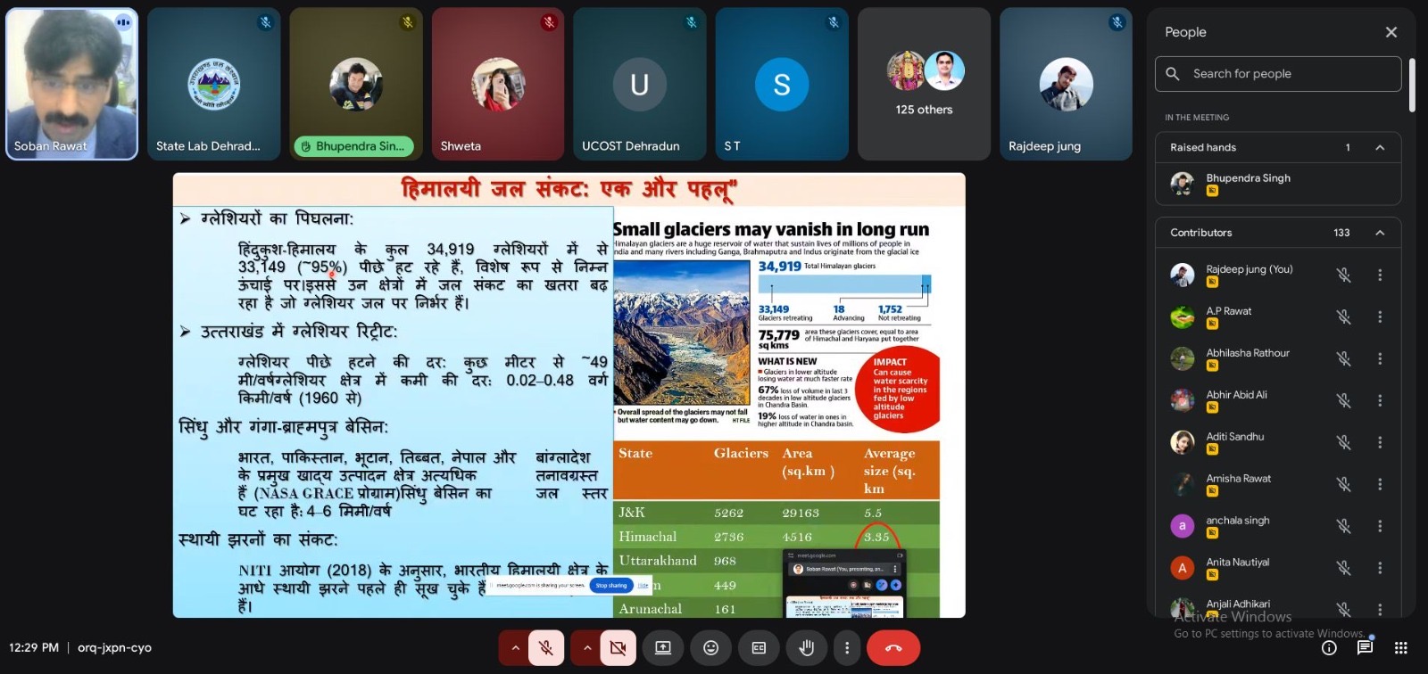 राष्ट्रीय जल विज्ञान संस्थान रूरकी के वरिष्ठ वैज्ञानिक डॉ सोबन सिंह रावत ने “वाटर रिसोर्सेज ऑफ़ उत्तराखंड: “प्रेजेंट स्टेटस, इमर्जिंग चैलेंजेज एंड सस्टेनेबल साल्यूशंस” विषय पर विशेषज्ञ व्याख्यान दिया। उन्होंने अपने व्याख्यान में भारतीय हिमालयी क्षेत्र से निकलने वाली नदियों की प्राचीन काल से लेकर वर्तमान तक की स्थिति, जल से संबंधित समस्याओं, उसके निराकरण पर प्रकाश डालते हुए विस्तार से बताया। उन्होंने उत्तराखंड राज्य के स्प्रिंगस की स्थिति तथा उत्तराखंड राज्य के साथ-साथ संपूर्ण भारतीय क्षेत्र की भविष्य की जल जरूरतों, जल उपलब्धता पर विस्तार से बताते हुऎ मिलकर कार्य करने पर बल दिया। उन्होंने राष्ट्रीय जल विज्ञान संस्थान द्वारा स्प्रिंगस के रिजुविनेशन की दिशा में किए जा रहे विभिन्न वैज्ञानिक कार्यों, रिमोट सेंसिंग एवं जीआईएस के वैज्ञानिक अनुप्रयोग, वर्षा की वास्तविक स्थित समझने के लिए सैटेलाइट के व्यापक प्रयोग के बारे में बताया।
